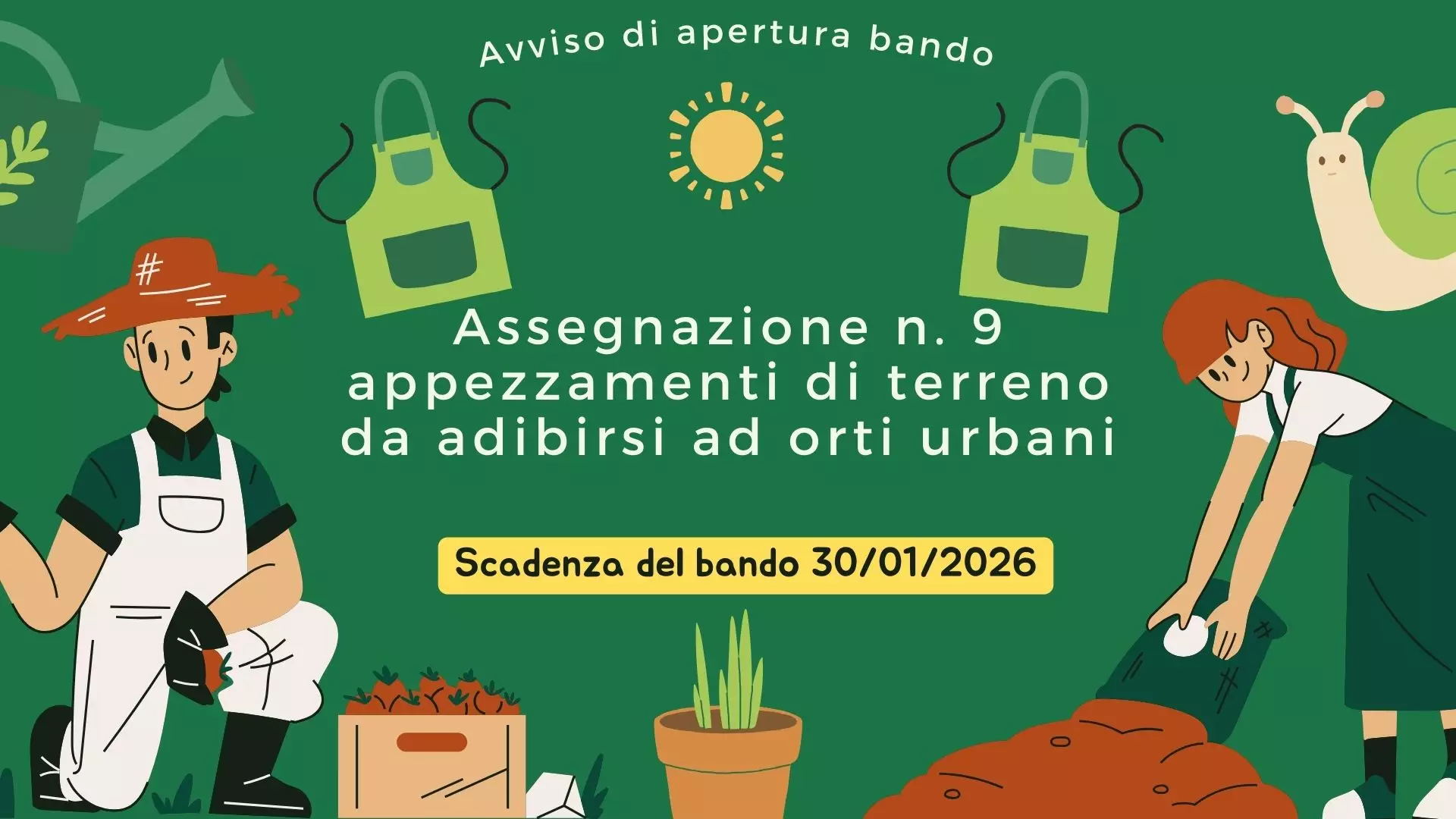 In allegato avviso di apertura Bando per l'assegnazione di n. 9 appezzamenti di terreno da adibirsi ad orti urbani